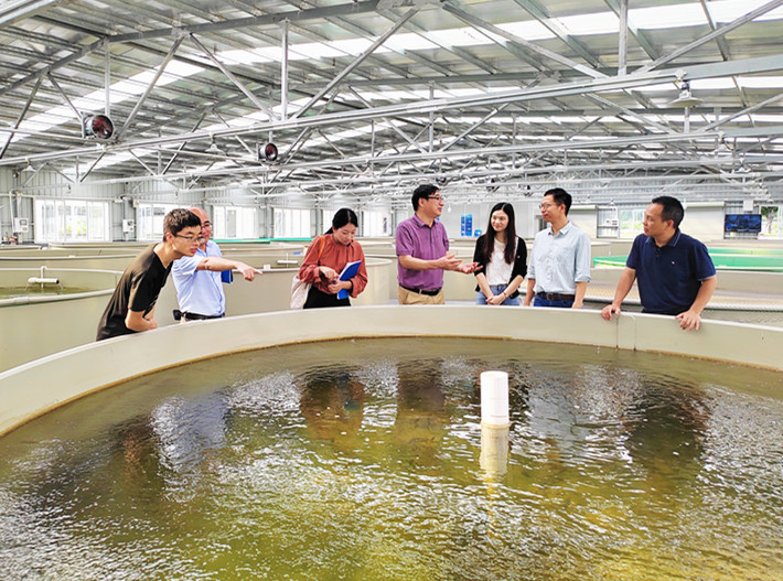 下午,调研组驱车赶往设在东涌镇的广东国际渔业高科技园,在科技园展览负责人郭晓奇、方琼玟等陪同下参观了广东渔业历史文化展厅和广东渔业发展成果展,调研组边参观边与布展具体负责人交流岭南渔业历史研究心得和资料,特别是近现代广东渔业科技成就。作为广东三届渔业种业科技博览会举办地,科技园建有多项高科技成果中试基地和试验。调研组考察了高密度循环水育苗技术、鱼塘种稻关键技术研发试验、工厂化养殖与鱼菜共生系统,以及珠江流域水产种质资源库等,感受到了该园区渔业种业发展的新成就,并对广东渔业科技发展有了更全面的了解和认识。