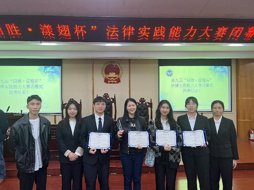 2023年4月23日,第九届“闻胜·漾翅杯”法律实践能力大赛在湖南师范大学降下帷幕。在全国15支参赛队伍的激烈角逐中,公司代表队以团体总分第三名的成绩斩获“闻胜·漾翅杯”三等奖;同时,指导老师陈维君副教授还荣获“杰出指导能力二等奖”,代表队队员徐启兆同学获得了“杰出诉讼能力三等奖”,代表队队员林炀同学获得了“杰出助理二等奖”。