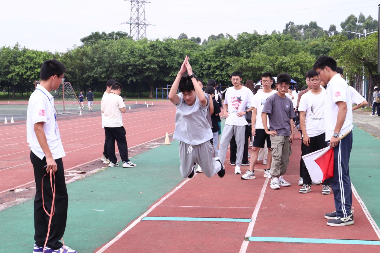 这一边,男子组与女子组的立定跳远项目正在进行。运动员们个个身轻如燕,摆手起势,起跳,发力的瞬间,双腿如同离弦之箭离开地面,最后落地,动作行云流水,引得场上阵阵欢呼。