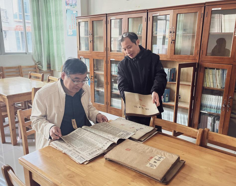 3月1日上午,考察团队抵达怀集县博物馆,受到馆长植中坚的热情接待。倪教授、王教授在植馆长陪同下,了解博物馆展出的农业文物,其中一件未见于报刊反映的耙田陶模型引起了倪教授、王教授的关注,分析其功用和在汉代岭南农耕技术上的价值。翻阅植馆长藏书,并就怀集地方传统农业历史,特别是燕岩的历史与保护等问题与植馆长进行了广泛、友好交流;临别之际植馆长还向团队赠送《广东省不可移动文物名录(怀集篇)》《燕岩文丛》《大美燕乡》等怀集历史书籍。随后,考察团队走访了怀集图书馆,了解馆藏图书状况,特别是地方文献收藏情况。团队成员仔细查阅20世纪60年代《怀集日报》,了解我国20世纪60年代县域农业发展情况,并结合报刊所载内容为研究生讲解当时农业生产的特点。
